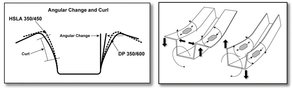 The relaxation of the atomic spacing and residual stress, or springback, in sheet metal causes the stamped part to react in three distinct ways. The part can twist, sidewalls and flanges endure angular changes, and sidewalls can curl. The twisting of the part is due to unbalanced strain pattern either in the sidewall or flange, or in some cases, both. The stresses in the stamping create a torsion effect and the part reacts to the torsion by twisting. Sidewalls and flanges change angularly, typically due to the thickness change that occurs as the metal moves over the forming radius. This thickness reduction coupled with varying strain levels throughout the wall depth creates a tension effect causing the wall and/or flange angle to change. Sidewall curl is a result of an uneven strain gradient that occurs during the bending and straightening of the material as it moves over the draw radius. These strain gradients will be different along the height of the wall, creating a curvature in the stamping.
